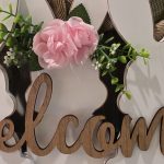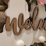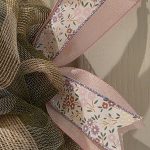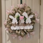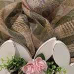 How adorable is this. Three rabbits with cute white tails and the flowers across the top. Beautiful green and tan mesh to help it stand out. Have pink ribbon and some flower ribbon going around it. It will look so pretty on your door or wall.
