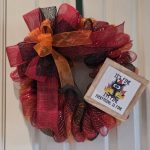 What a funny wreath. It will definitely put a smile on your face every time you look at it. We all have those moments. Made with orange, black and red mesh and has a matching bow. Add some humor to you wall or door.