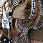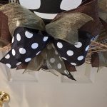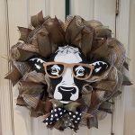 Adorable farmhouse cow wreath with brown glasses made from brown burlap mesh with black and white checkered pattern and green and brown ribbon with a matching bow.